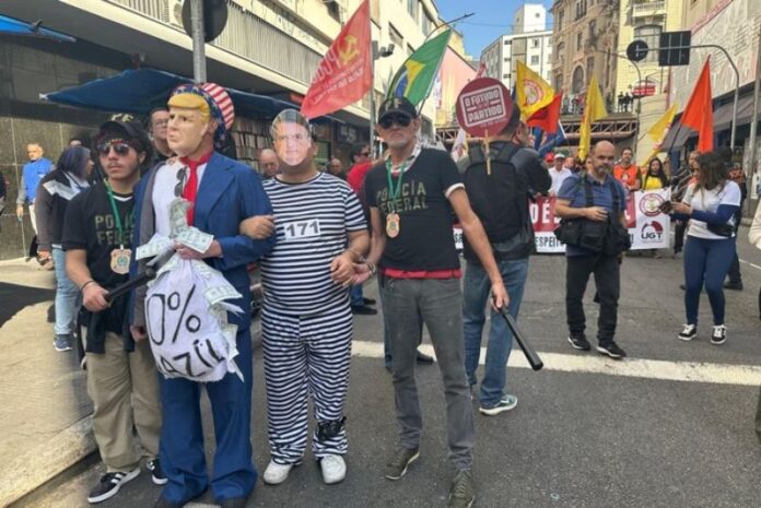 Com a Polícia Federal (PF) acompanhando homens fantasiados de Donald Trump carregando um saco de dinheiro e do ex-presidente Jair Bolsonaro (PL) vestido como prisioneiro na linha de frente, comerciantes e trabalhadores ocuparam, na manhã desta sexta-feira (18/7), a Rua 25 de Março, no centro de São Paulo, em uma manifestação contra a investigação anunciada pelo presidente dos Estados Unidos sobre o comércio brasileiro.