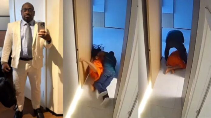 O advogado cai sobre a mulher, que bate o rosto no chão. Em seguida, ele a levanta e a retira do local à força.