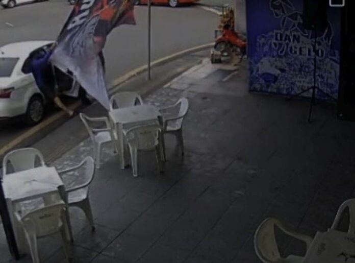O vídeo mostra o momento em que os suspeitos descem de um Siena, sem placa visível, e puxam à força a bandeira que estava pendurada na fachada de um comércio. Como o objeto estava bem fixado, parte do tecido acabou sendo rasgada durante a ação.