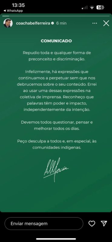 “Repudio toda e qualquer forma de preconceito e discriminação. Infelizmente, há expressões que continuamos a perpetuar sem que nos debrucemos sobre o seu conteúdo. Errei ao usar uma dessas expressões na coletiva de imprensa. Reconheço que palavras têm poder e impacto, independentemente da intenção. Devemos todos questionar, pensar e melhorar todos os dias. Peço desculpa a todos e, em especial, as comunidades indígenas”, afirmou o técnico do Palmeiras.