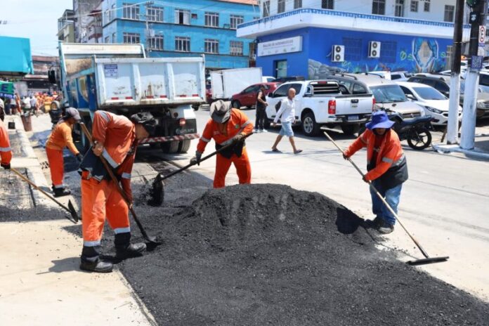 A Prefeitura de Manaus, por meio da Secretaria Municipal de Infraestrutura (Seminf), deu continuidade ao programa “Mutirão no Centro”, nesta sexta-feira, 29/8, com serviços de recuperação asfáltica na rua Barão de São Domingos, em frente à entrada da feira Manaus Moderna.