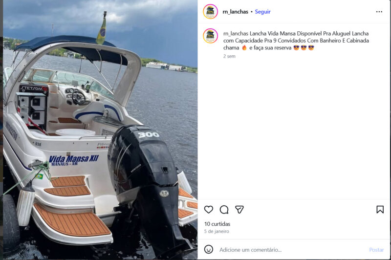 No boletim de ocorrência registrado no 19º Distrito Integrado de Polícia (DIP), Fredson relatou que a lancha havia sido alugada por R$ 1.500 via Pix, com devolução prevista para a tarde do mesmo dia. Segundo ele, após a embarcação não ser entregue no horário combinado e sem conseguir contato com os responsáveis, decidiu procurar a polícia e registrar ocorrência por apropriação indébita, antes mesmo da apreensão feita pela PM.