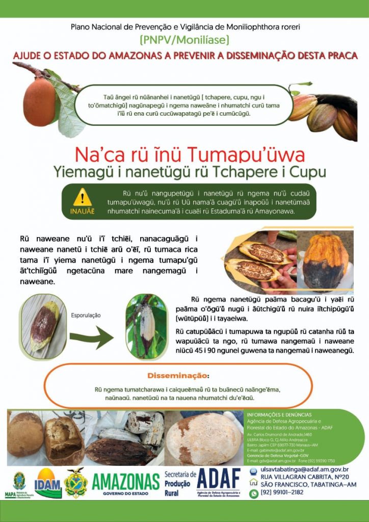 Encabeçado pela Agência de Defesa Agropecuária e Florestal do Amazonas (Adaf) e pelo Ministério da Agricultura, Pecuária e Abastecimento (Mapa), o combate à monilíase ganhou um importante instrumento na região do Alto Solimões, que tem alta concentração de comunidades indígenas. Nos municípios de Tabatinga e Benjamin Constant (respectivamente, a 1.108 e 1.121 quilômetros de Manaus), onde a praga foi identificada, um cartaz todo elaborado na língua Tikuna tem levado informação aos produtores rurais da agricultura familiar indígena.