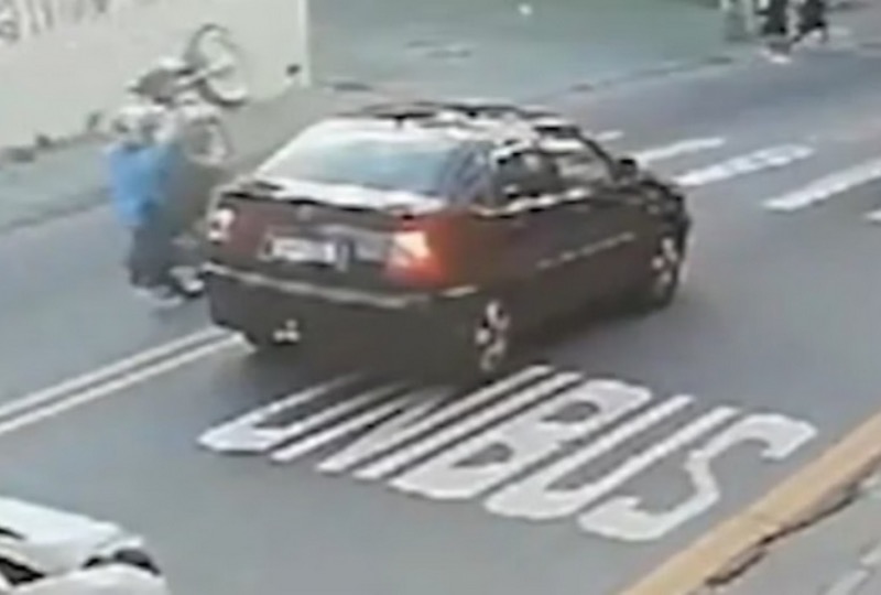 Câmeras de segurança mostram o momento em que o menor empina o veículo na contramão e acerta as duas vítimas que atravessavam a rua um pouco após a faixa de pedestre.