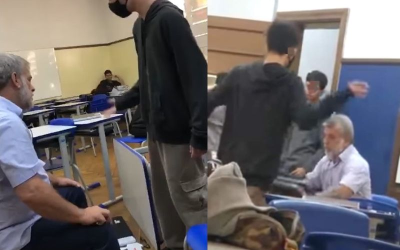 Nas imagens é possível ver o estudante apontando o dedo no rosto do professor, ameaçando e em seguida jogando sua mesa no chão.