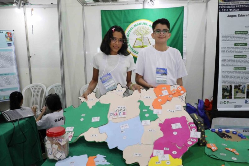 Os alunos Joelma Amorim e Enderson Bruno, da educação especial da EE Manuel Antônio de Souza, apresentaram o projeto “Jogos Educativos: Mapeando com a Matemática”, que tem como objetivo estimular o estudo interdisciplinar da Matemática, Geografia, Língua Portuguesa e o ensino de Libras, de maneira lúdica e interativa.