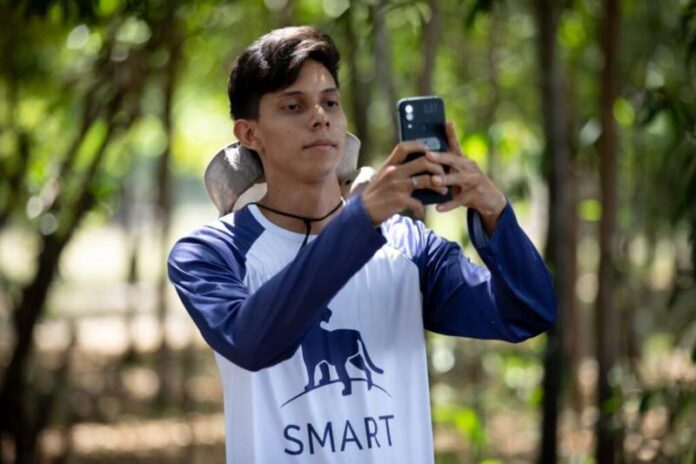 Um dos monitores ambientais comunitários formados é o estudante universitário Kelbert Batista da Cruz, de 21 anos, que dedica 15 dias do mês ao monitoramento da biodiversidade no Parque Estadual do Matupiri.