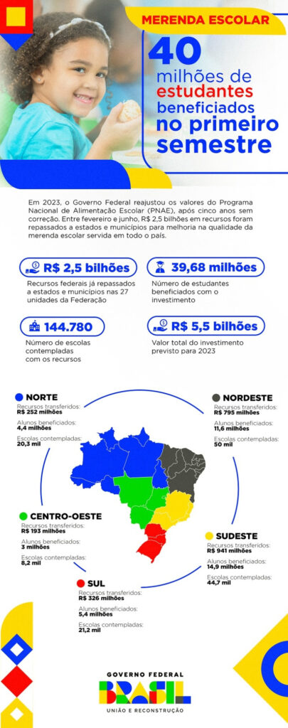 O Programa é administrado pelo FNDE, autarquia vinculada ao MEC. Ao longo de 2023, serão R$ 5,5 bilhões para melhorias da alimentação escolar de cerca de 40 milhões de estudantes da educação básica pública em, aproximadamente, 150 mil escolas do país.