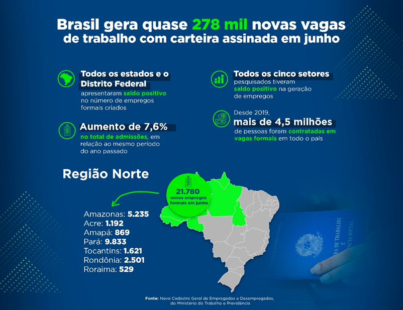 Em toda a Região Norte, foram registrados 21.780 postos formais, com o pódio formado por Pará, Amazonas e Rondônia, com a criação de 9.833, 5.235 e 2.501 vagas, respectivamente. Na sequência, estão: Tocantins com 1.621 novos empregos; Acre, com 1.192 vagas; Amapá, com 869; e Roraima, que teve 529 contratações em junho.