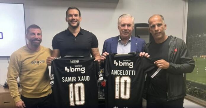 Ancelotti e Xaud receberam camisas personalizadas do Vasco com o número 10 e os seus nomes no verso da peça.