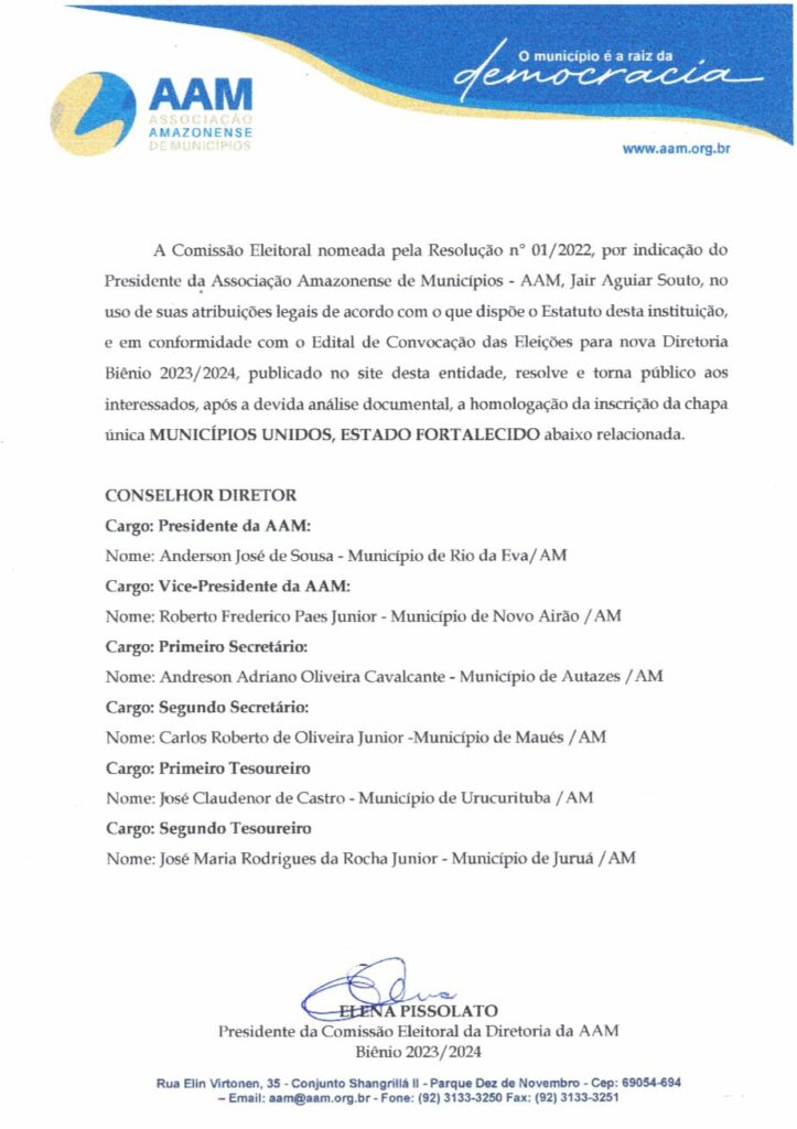 De acordo com o presidente da AAM e vice-presidente para a Região Norte da Confederação Nacional dos Municípios (CNM), Jair Souto, que é prefeito de Manaquiri, Anderson é candidato único para eleição da nova diretoria da associação biênio 2023/2024.