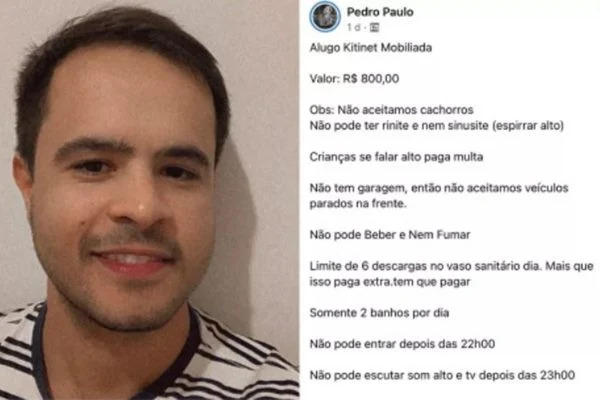 Um síndico de 35 anos conseguiu viralizar um anúncio fictício de aluguel de uma kitnet que ele fez “com exigências absurdas e contra a lei” na capital de Goiás. Entre as regras, Pedro Paulo Guedes Leão listou que o inquilino “não pode ter rinite e nem sinusite (espirrar alto)”, além do “limite de 6 descargas no vaso sanitário” e “somente dois banhos” por dia.