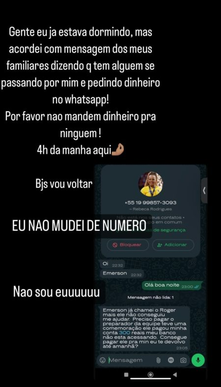 “Gente, eu já estava dormindo, mas acordei com mensagem dos meus familiares dizendo que tem alguém se passando por mim e pedindo dinheiro no WhatsApp! Por favor, não mandem dinheiro para ninguém! 4h da manhã aqui. Beijos, vou voltar [a dormir]”, escreveu a ginasta.