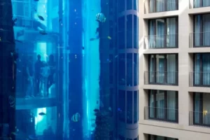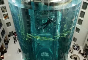 O aquário gigante abrigava um elevador panorâmico e ficava dentro de um complexo hoteleiro no bairro de Mitte, um dos mais movimentados do centro da capital alemã. Dentro do espaço há um hotel, um museu e restaurantes.