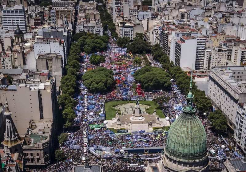Às 13h20 — O Ministério da Segurança implementa o protocolo contra manifestações. Uma força-tarefa da Polícia Federal, em conjunto com a Gendarmeria (espécie de Polícia Civil), se posiciona em frente ao Congresso, onde milhares de trabalhadores estavam concentrados durante a manifestação. No entanto, a população já tinha bloqueado completamente as avenidas Rivadavia e Entre Ríos. Ação faz parte da lei aprovada pelo governo contra os “piquetis”, método de protesto característico argentino, onde manifestantes bloqueam as avenidas principais.