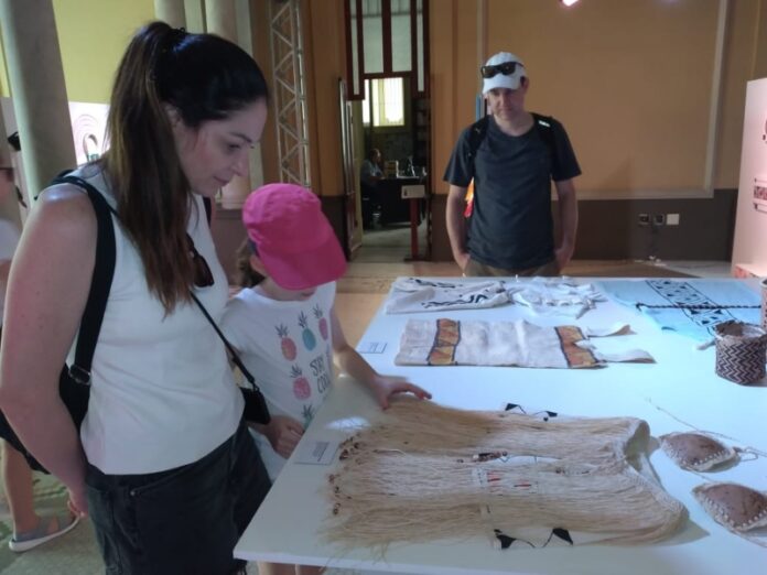 As três artistas do povo ticuna: Elizete Ticuna, Angélica Nery Aiambo e Natália Ticuna vieram de aldeias do Alto Solimões, município de Benjamin Constant, e apresentam a arte do seu povo em quadros, roupas e cestaria, durante a Segunda Mostra de Arte Indígena de Manaus, da prefeitura, por meio do Conselho Municipal de Cultura (Concultura) e Fundação Municipal de Cultura, Turismo e Eventos (Manauscult), em exposição até o dia 31 de outubro, no Palácio Rio Branco, avenida 7 de setembro, centro histórico.