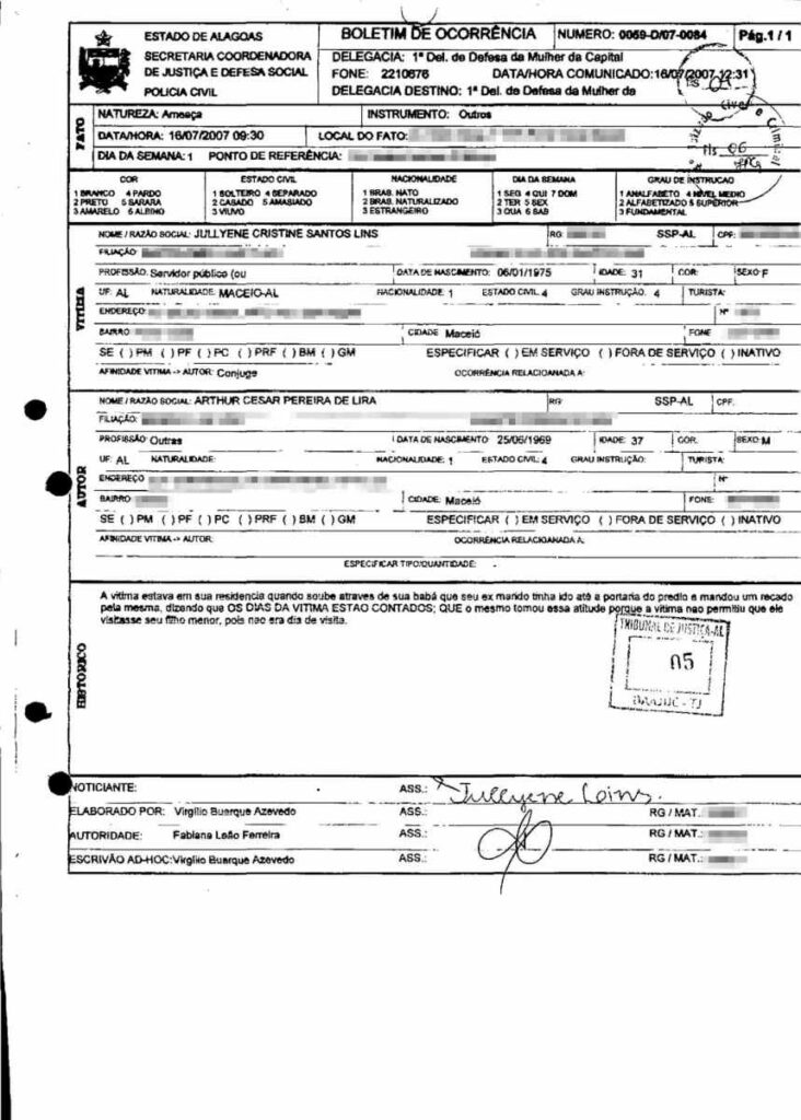 Essa parte do relato de Jullyene Lins consta em seu depoimento à Delegacia Especial de Defesa dos Direitos da Mulher em 18 de abril de 2007. Na época ela não relatou que Lira também a teria estuprado naquela mesma noite. “Aconteceu uma coisa que eu nunca contei a ninguém, ele disse pra mim: ‘Você está atrás de macho, eu vou lhe mostrar quem é o homem’.