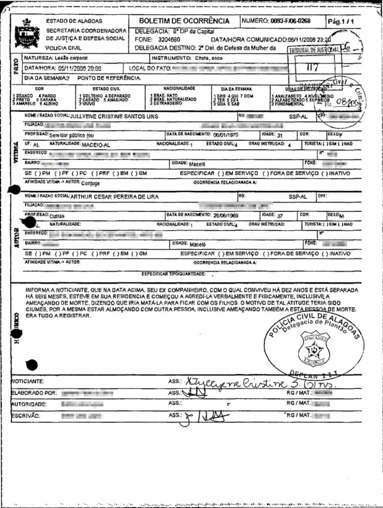 Durante cerca de 40 minutos, conforme relato de Jullyene, ele a teria agredido com “tapas, murros, chutes e a puxado pelo cabelo”.