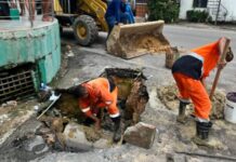As equipes atuam na limpeza e desobstrução das sarjetas, utilizando ferramentas como enxadas e picaretas para remover resíduos acumulados, entre areia, lixo e sedimentos que impedem o fluxo adequado da água.