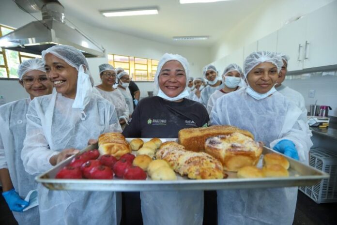 Beneficiárias do Programa Social e Ambiental de Manaus e Interior (Prosamin+) participaram, nesta quarta-feira (30/07), do curso de padaria artesanal, no Centro de Convivência da Família Teonízia Lobo, zona leste de Manaus. A capacitação faz parte das ações da Política de Gênero do Prosamin+, programa que é coordenado pela Unidade Gestora de Projetos Especiais (UGPE), órgão da Secretaria de Estado de Desenvolvimento Urbano e Metropolitano (Sedurb).