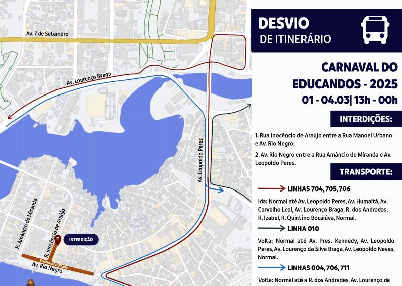 Em relação ao transporte público, haverá alterações em itinerários de linhas apenas no bairro do Educandos. Entre 13h e meia-noite dos dias 1º, 2, 3 e 4 de março as linhas 704, 705 e 706 serão alteradas no sentido Centro, e passarão a adotar o seguinte itinerário: normal até a avenida Leopoldo Peres, então seguem pela avenida Humaitá, avenida Carvalho Leal, avenida Lourenço Braga, rua dos Andradas, rua Izabel, rua Quintino Bocaíuva e depois seguem o itinerário normal.