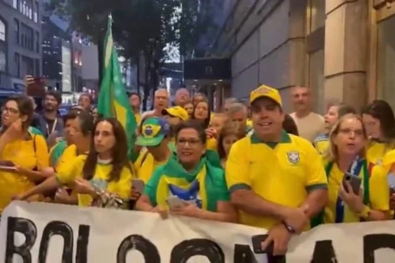 Em frente ao hotel de Nova York em que @jairbolsonaro ficará hospedado, grupos antagônicos gritam frases de efeito.