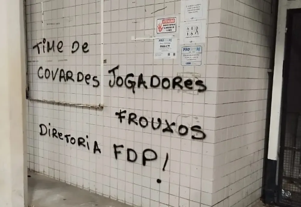 Nas pichações no estádio, o empresário foi chamado de comediante e ofendido com mensagem em inglês (“fuck you, Textor”), além de outra com ameaça: “O Botafogo vale mais que sua vida”, com cifrão, símbolo associado a dinheiro, ao lado de uma das pichações. Em outras, os jogadores foram chamados de covardes e frouxos.