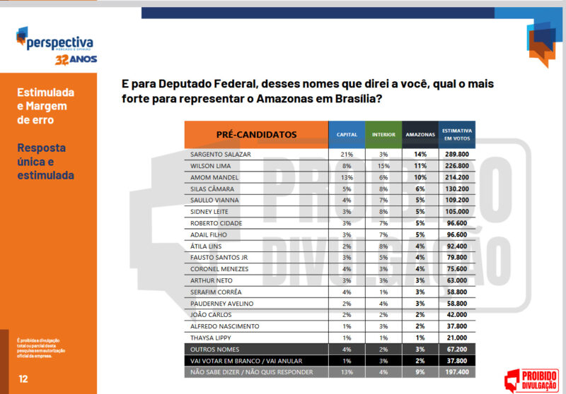 Para a Câmara Federal, quem lidera é o Sargento Salazar (14%), seguido por Wilson Lima (11%), Amom Mandel (10%), Silas Câmara (6%), Saullo Vianna (5%), Sidney Leite (5%), Roberto Cidade (5%), Adail Filho (5%), Átila Lins (4%), Fausto Júnior (4%), Coronel Menezes (4%), Arthur Neto (3%), Serafim Corrêa (3%), Pauderney Avelino (3%), João Carlos (2%), Alfredo Nascimento (2%) e Thaysa Lippy (1%).