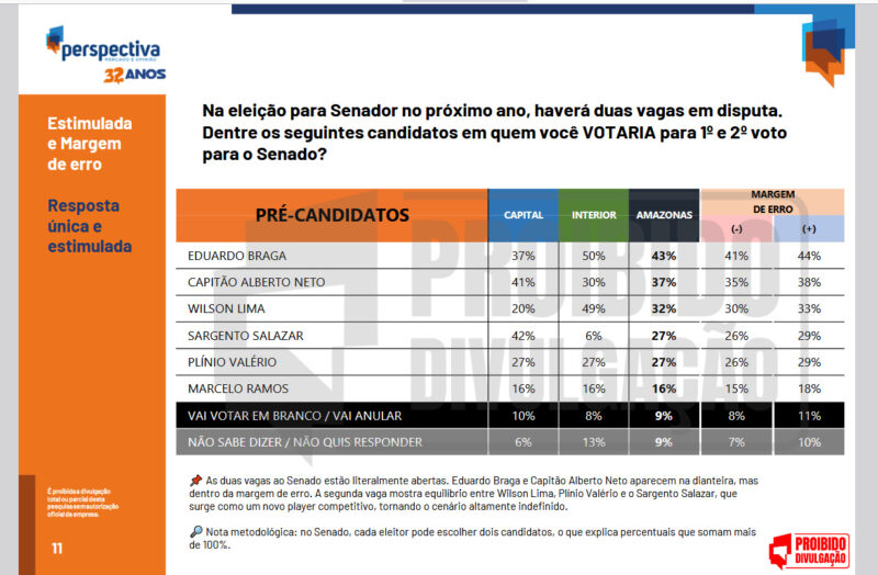 Uma nova pesquisa de intenção de voto, divulgada nesta quarta-feira (17) pela Perspectiva, Mercado e Opinião, aponta cenário acirrado para a disputa pelo Senado em 2026. Os nomes mais citados são: Eduardo Braga (43%), Capitão Alberto Neto (37%), Wilson Lima (32%), Sargento Salazar (27%), Plínio Valério (27%) e Marcelo Ramos (16%).