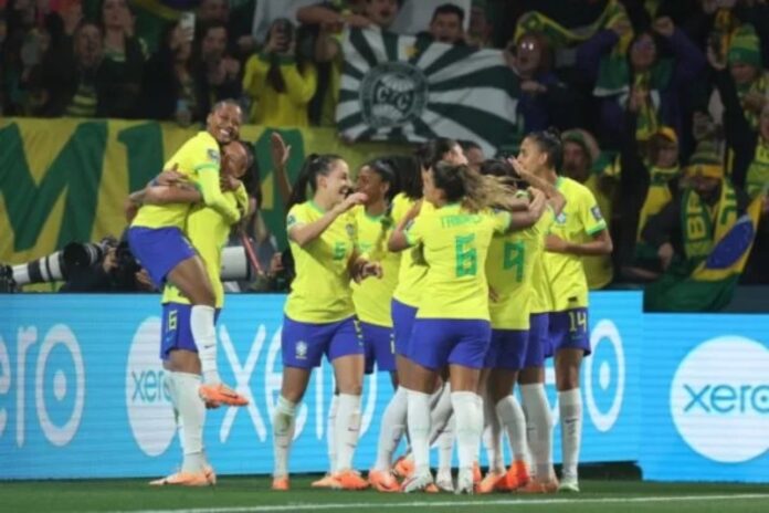E aos 19 minutos, o Brasil abriu o placar: em boa trama de Tamires e Debinha, Ary Borges marcou, de cabeça, o primeiro gol da Seleção na Copa.
