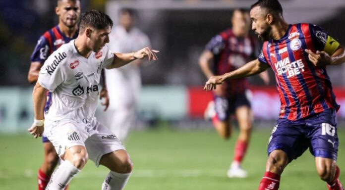 Com muita emoção e gols no segundo tempo, Santos e Bahia empataram por 2 a 2, na noite deste domingo (6), na Vila Belmiro, pela segunda rodada do Brasileirão, e seguem sem vencer no campeonato.