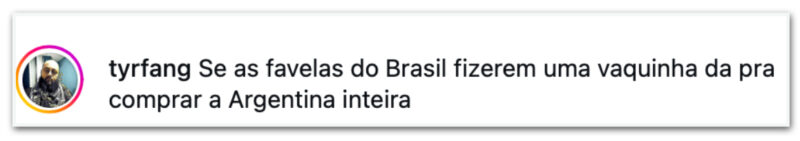 Entre os comentários mais compartilhados, um internauta escreveu: “Se as favelas do Brasil fizerem uma vaquinha, dá para comprar a Argentina inteira”. Outro ironizou: “Com 100 reais a gente compra 10 garrafas de vinho, 20 empanadas, o time do Boca e ainda sobra troco pra comprar Buenos Aires! Respeita”.