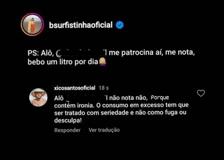 Santos comentou na postagem de forma irônica. “Não nota, não! Porque contém ironia. O consumo em excesso tem que ser tratado com seriedade e não como fuga ou desculpas”.