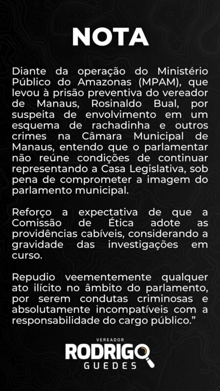 O vereador Rodrigo Guedes (PP), declarou em nota distribuída à imprensa, que o vereador Rosinaldo Bual (Agir) “não reúne condições de continuar representando a Casa Legislativa”. A Justiça já decidiu pelo afastamento do investigado das funções parlamentares por 120 dias