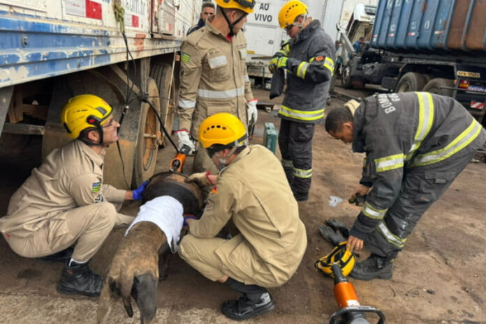 Segundo os bombeiros, a cadela apresentava ferimentos no pescoço e respiração ofegante, provavelmente em decorrência da compressão provocada pelo peso da peça metálica sobre a garganta.
