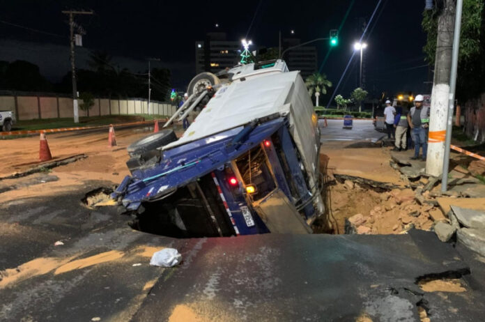 Na madrugada desta quarta-feira (11), um caminhão coletor de lixo foi engolido por uma cratera que se abriu na avenida Coronel Teixeira, no bairro Ponta Negra, Zona Oeste de Manaus. O incidente foi causado pelo rompimento de uma tubulação de grande porte, por volta de 1h, segundo informações da concessionária Águas de Manaus. Apesar da gravidade do ocorrido, não há registros de feridos.