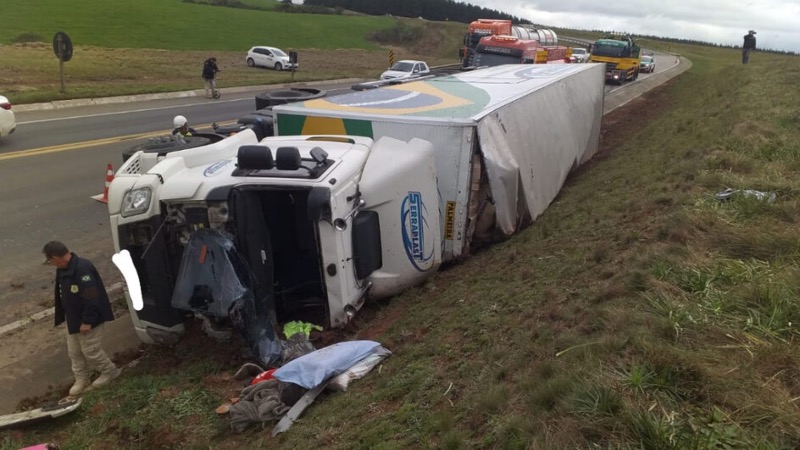 Uma mulher morreu e dois homens ficaram feridos após uma carreta tombar na BR-116, na região de Ponte Alta, na Serra catarinense, na tarde de segunda-feira (29). O condutor do caminhão e outro passageiro foram levados com ferimentos ao hospital.