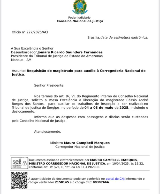 O Corregedor Nacional de Justiça, ministro Mauro Campbell Marques, solicitou do Tribunal de Justiça do Amazonas (TJAM), a liberação do juiz Cássio André Borges dos Santos para auxiliar nos trabalhos de inspeção no Tribunal de Justiça de Sergipe.