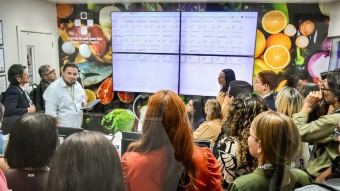 Entre os setores visitados, os participantes conheceram o Painel de Controle da Operação de Nutrição, que permite o monitoramento digital de todas as etapas da alimentação hospitalar, desde a prescrição até a entrega.