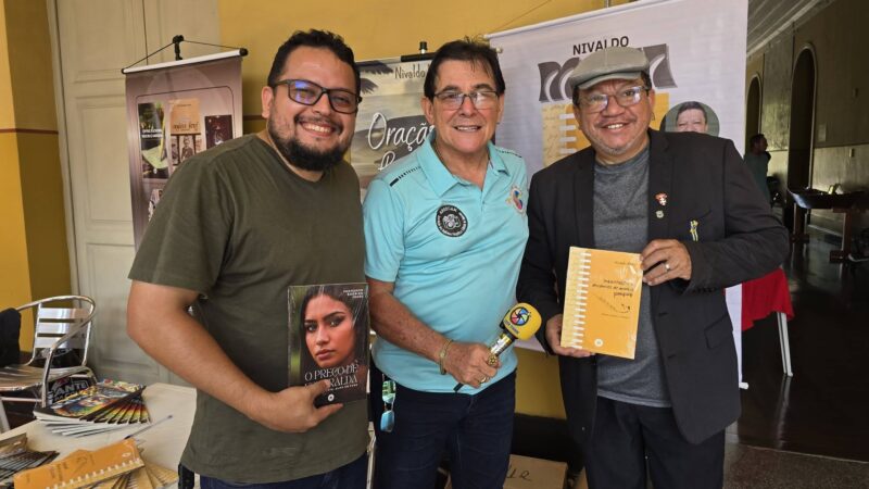 O psicólogo e escritor Hira Mesquita lançou o livro Na Batida do Amazonas, ladeado dos ex dançarinos do grupo Carrapicho, Ianael Santos e Hudson Praia.