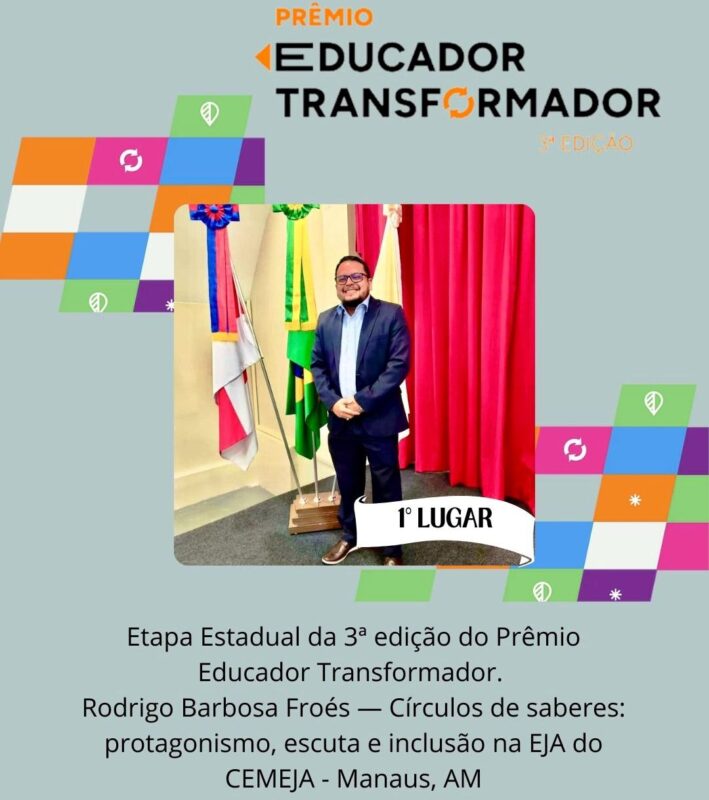 O professor Rodrigo Froés é o grande vencedor do Prêmio Educador Transformador, organizado pelo Sebrae, trabalho desenvolvido no CEMEJA Professor Samuel Benchimol.