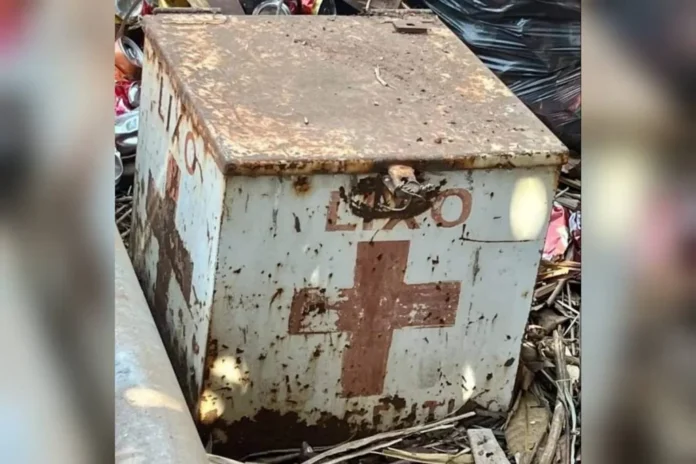 A denúncia inicial é de que a substância radioativa, utilizada em aparelhos antigos de radioterapia, estaria armazenada em um cubo de concreto, dentro de uma caixa de ferro. Nessa caixa, conforme imagens divulgadas pela Polícia Militar de Goiás (PMGO), consta a palavra “lixo” sobre o símbolo de uma cruz hospitalar.