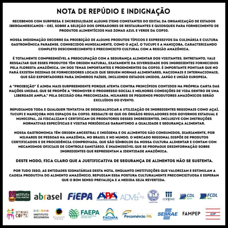 Diante disso, as instituições que assinam a nota de repúdio pedem que a medida seja revista com urgência. “Esperamos que o bom senso prevaleça, para que a COP30, realizada em plena Amazônia, seja também um espaço de respeito e valorização da nossa cultura alimentar”, concluíram.