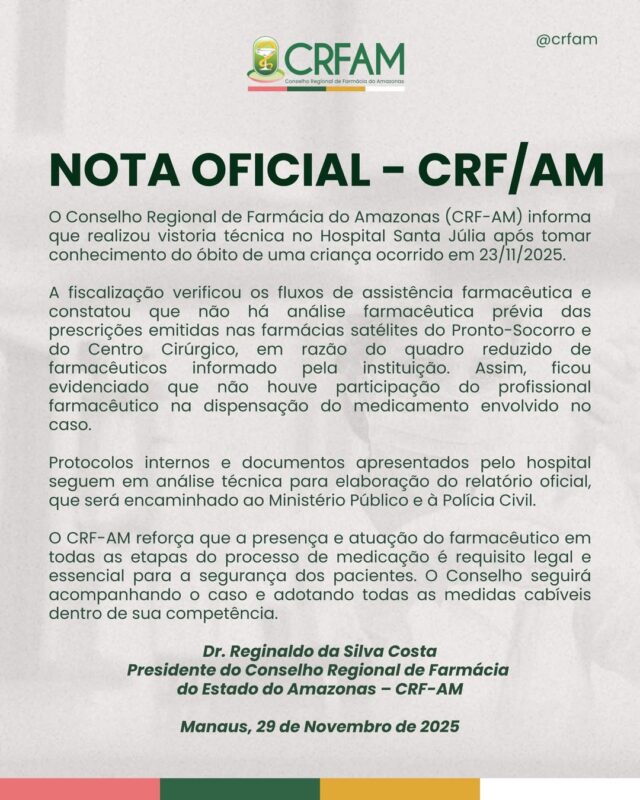 A nota destaca ainda que o CRF-AM continuará acompanhando o caso e adotará todas as medidas cabíveis dentro de sua competência.