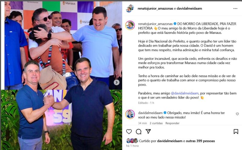 “Hoje é Dia Nacional do Prefeito, e quanto orgulho ter um líder tão dedicado em trabalhar pela nossa cidade. O David é um homem que tem meu respeito, minha admiração e minha total confiança. Um gestor incansável, que acorda cedo, enfrenta os desafios e não mede esforços pra transformar Manaus numa cidade cada vez melhor pra todos”, escreveu no Instagran Renato Junior.