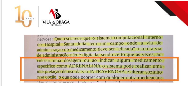 Um trecho do habeas corpus — baseado no depoimento do pediatra Luiz Felipe Reis Carvalho Sordi, que também atua no Hospital Santa Júlia — reforça essa possibilidade. Ele afirma que o software possui um campo no qual a via é “clicada”, mas que o sistema pode, sozinho, modificar a forma de administração, sem intervenção do prescritor, especialmente no caso de medicamentos de alta vigilância, como a adrenalina.