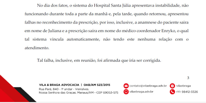 No documento, os advogados Felipe Braga de Oliveira e Alessandra Seriacopi Vila afirmam que o sistema interno do hospital apresentou instabilidade no dia do atendimento e que a médica selecionou corretamente, em campo específico do sistema, a via de nebulização para a administração da adrenalina — conduta compatível com os protocolos pediátricos. Contudo, segundo a defesa, o sistema teria alterado automaticamente a via para intravenosa, sem que a profissional percebesse a mudança.