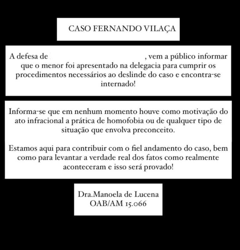 Em publicação nas redes sociais, a advogada afirmou que o menor está à disposição da Justiça e repudiou a hipótese de motivação discriminatória. “O menor foi apresentado na delegacia para cumprir os procedimentos necessários ao deslinde do caso e encontra-se internado. Informa-se que, em nenhum momento, houve como motivação do ato infracional a prática de homofobia ou qualquer tipo de situação que envolva preconceito. Estamos aqui para contribuir com o fiel andamento do processo e para levantar a verdade real dos fatos como realmente aconteceram, e isso será provado!”, declarou Lucena.