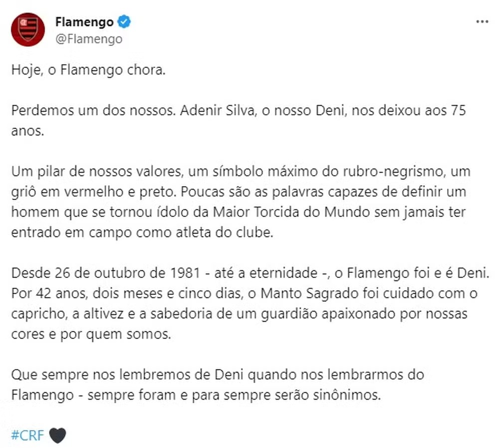 O clube lamentou a perda de “um dos nossos”, “um pilar de nossos valores, um símbolo máximo do rubro-negrismo, um griô em vermelho e preto”, em publicação nas redes sociais. O Flamengo escreveu: “Hoje, o Flamengo chora… Poucas são as palavras capazes de definir um homem que se tornou ídolo da Maior Torcida do Mundo sem jamais ter entrado em campo como atleta do clube”.