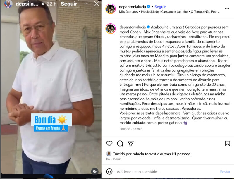 A deputada federal Antônia Lúcia (Republicanos-AC) tornou público, nesta terça-feira (2), um profundo desabafo sobre o fim de seu casamento com o deputado Silas Câmara (Republicanos-AM), ao alterar sua biografia no Instagram e publicar uma sequência de acusações contra o marido. Segundo ela, o relacionamento vive uma ruptura há mais de um ano, marcada por distanciamento, sofrimento familiar e supostas infidelidades.